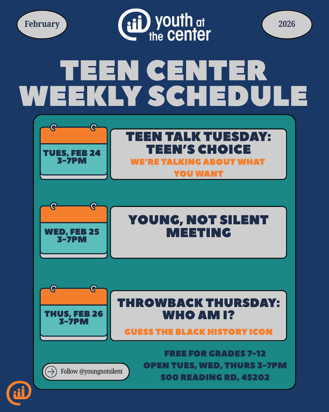 TEEN CENTER OPEN TUES, WED, THURS 3-7pm